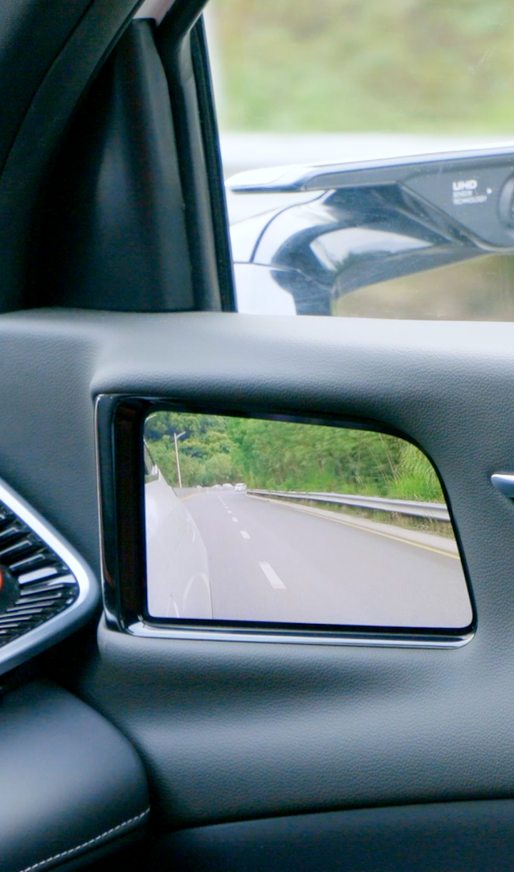 車規(guī)級(jí)OLED柔性屏貼合A柱設(shè)計(jì),通過算法實(shí)現(xiàn)A柱“透明化、可視化”,不影響造型美觀與A柱強(qiáng)度情況下,完美解決A柱盲區(qū)問題。